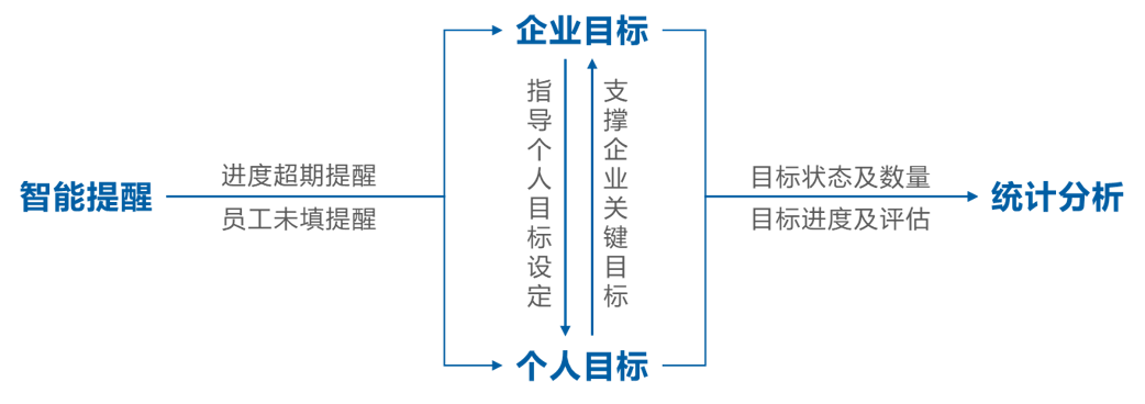 围绕企业战略目标拆解部门及个人目标,减少目标偏离现象; 同步员工之间的关键目标设定,确保全员目标高度协同透明。