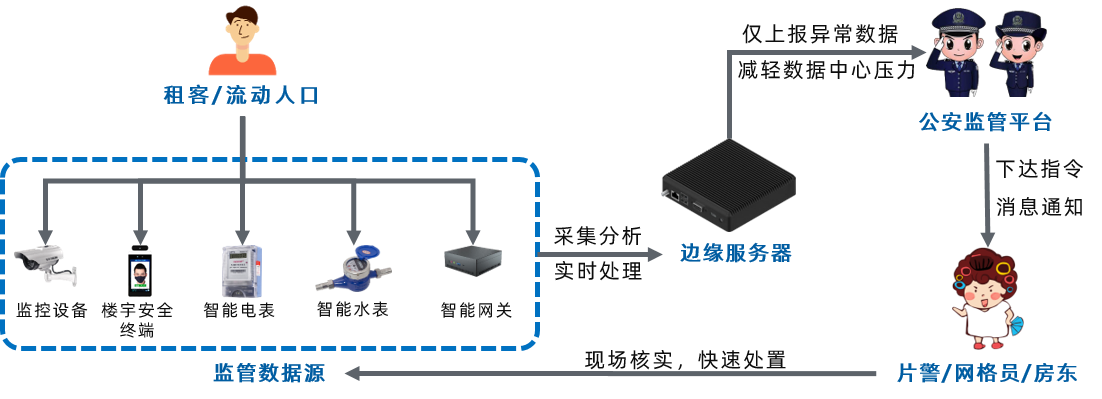 接入智能安防设备,实现安防数据数字化管理; 实时采集分析水电等数据,及时消除安全隐患。
