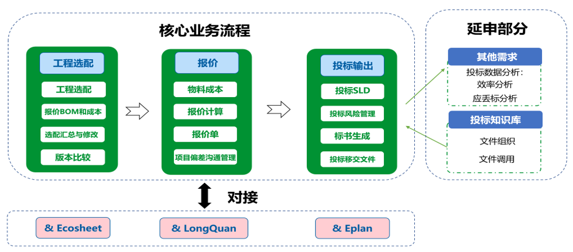 对接现有产品数据库与其他业务系统,实现在线智能产品选配与项目报价,生成CAD并对接ERP、强化投标部门、工程部门及财务部门的协同能力